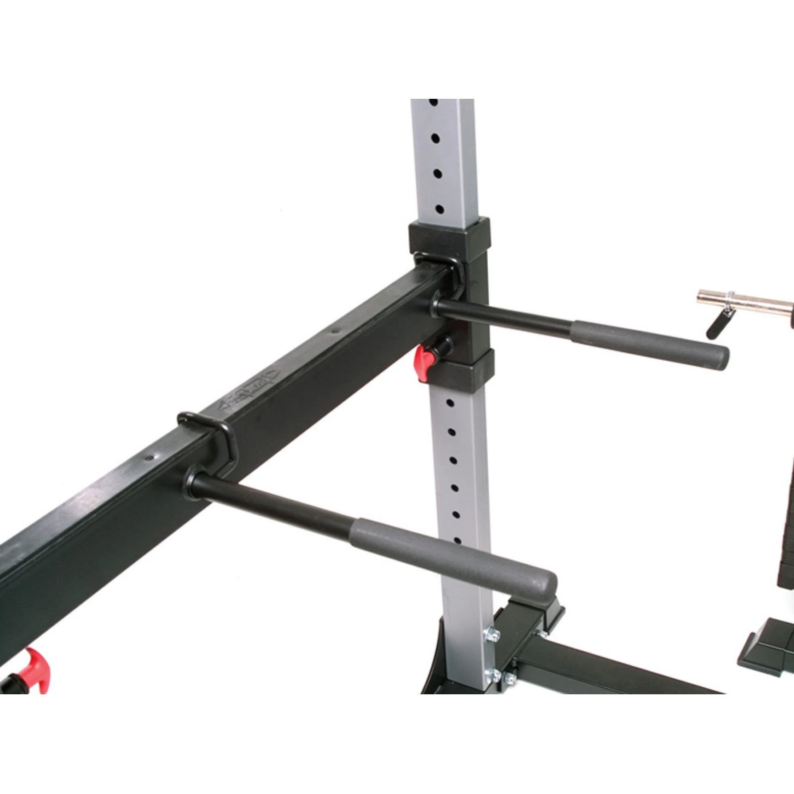 Komplettera din power rack från Bodycraft med denna enkla men mycket praktiska BodyCraft dipsstation F430. Träna hela bål- och överkroppsmuskulaturen med dips, omvända dips och push-ups. Dipsställningen sitter praktiskt fast på hållarna på sidorna, vilket gör det enkelt att ta bort och sätta dit den. Med de höj- och sänkbara handtagen på sidorna kan dipsstationen placeras på nästan vilken höjd som helst.