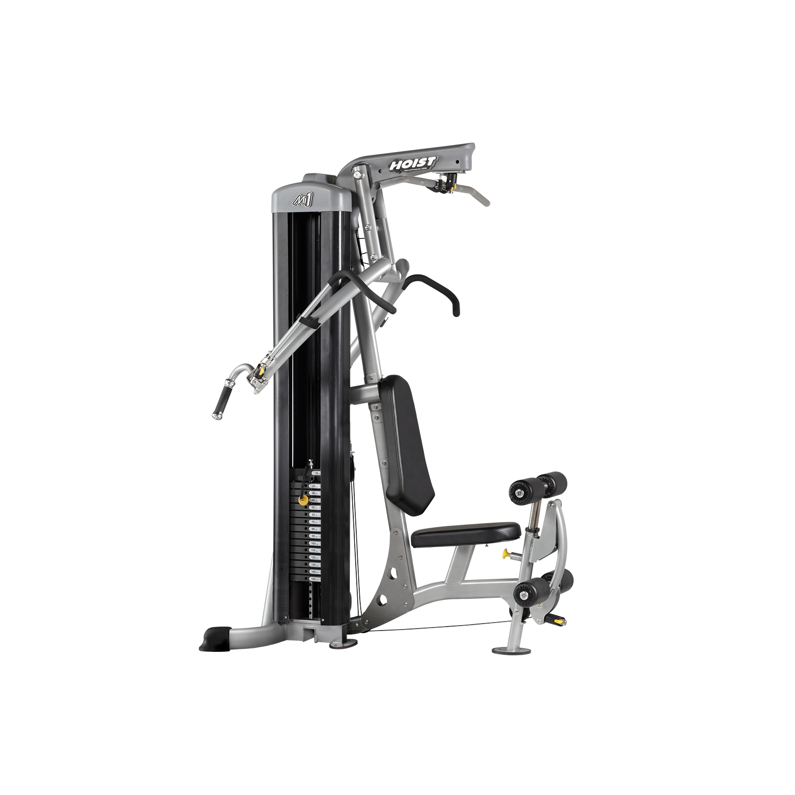 Hoist Fitness-multigym Mi1 är ett kompakt gym för daglig användning hemma. Med detta omfattande multigym kan du träna alla muskelgrupper. Med de olika huvudena och de olika inställningsalternativen för tryck- och dragövningar, har du en otrolig mängd övningar för din bröst-, axel- och ryggmuskulatur. Dessutom har M1 ett kabeldrag som ger dig ytterligare träningsalternativ för överkroppen och underkroppen. För att helkroppsträningen ska bli komplett måste också underkroppen involveras. Benböjarmodulen för träning i sittande läge och bencurlmodulen för träning i stående position hjälper till med detta. Om det inte räcker för dig har du möjlighet att utöka M1-gymmet med en benpress och viktblock från 68,4 kg (150 lbs) till 90,7 kg (200 lbs).