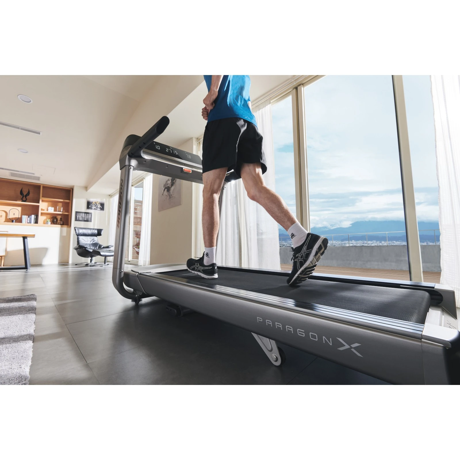 Paragon X från Horizon är tillverkad av högkvalitativt material och övertygar med sin moderna, tilltalande design. Användningen är särskilt intuitiv och enkel. Med one-touch-kontrollen kan du mycket enkelt starta och avsluta träningen. Tack vare de inbyggda snabbvalsknapparna på handtagen kan du ändra lutning och hastighet. Samtidigt ger touch-knapparna en jämn och exakt kontroll av lutning och hastighet. De integrerade transporthjulen och vikmekanismen gör det möjligt att flytta Paragon X snabbt och enkelt.