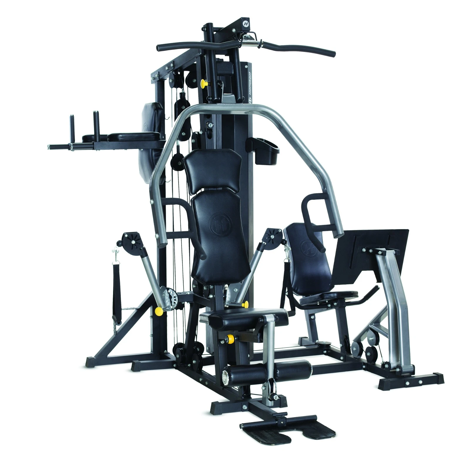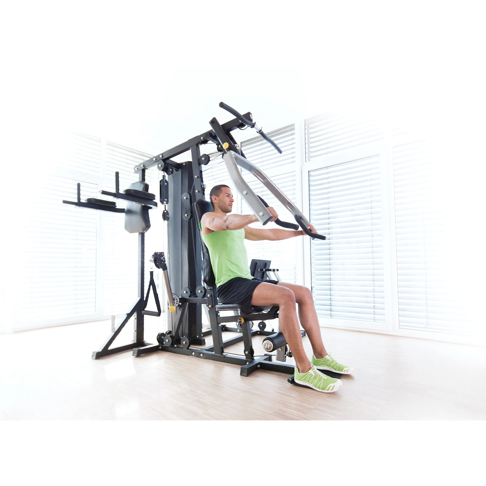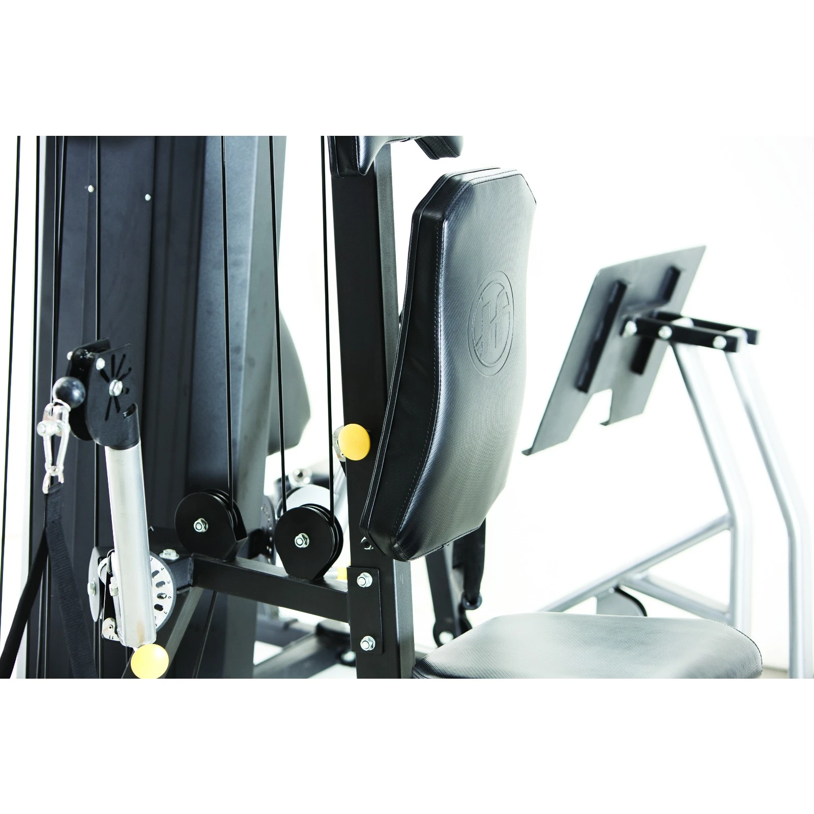- Multifunktionell hemgym med moduler för bensträck, benpress, dip-modul, latsdrag, fritt kabeldrag, kabeldrag nere, bröstpress mm