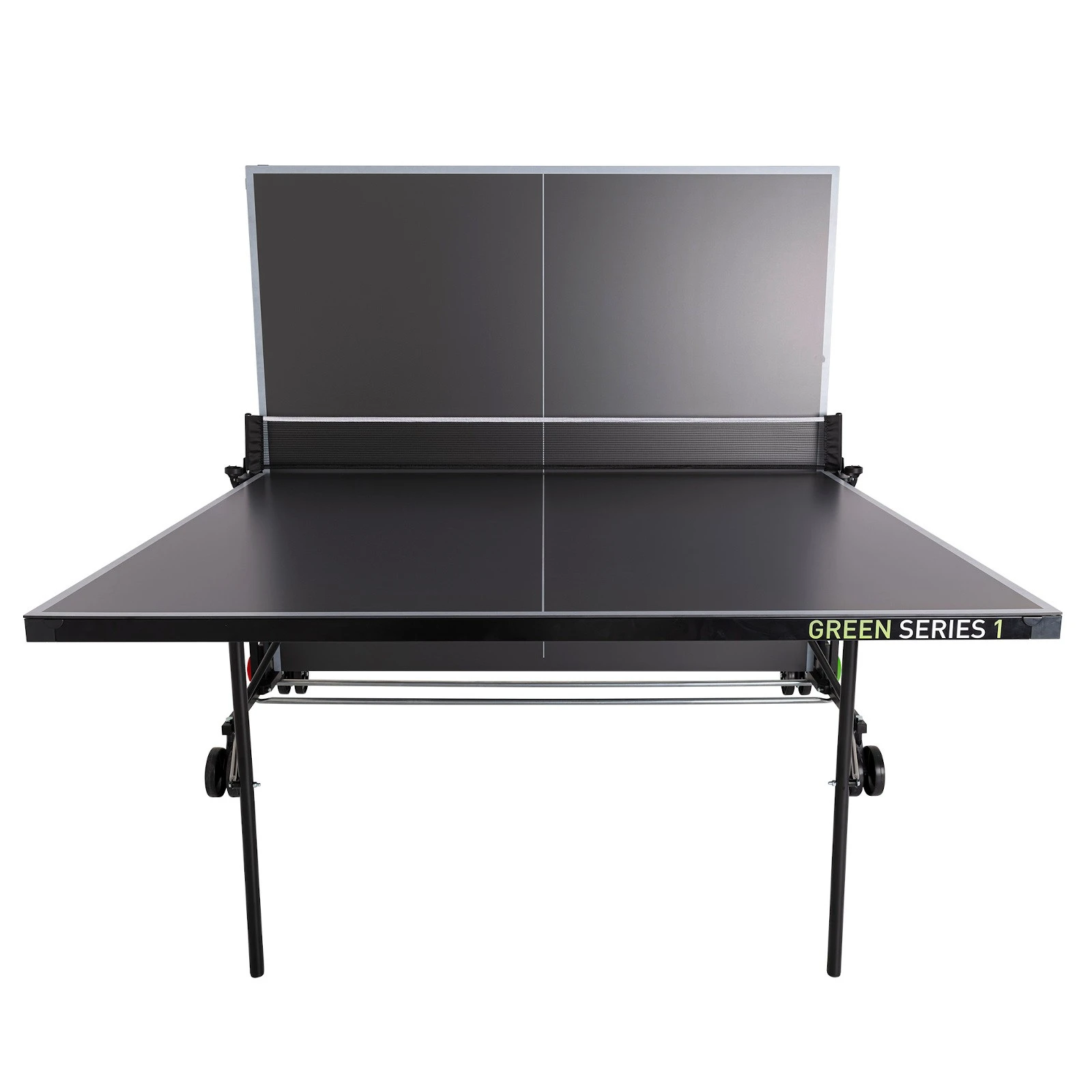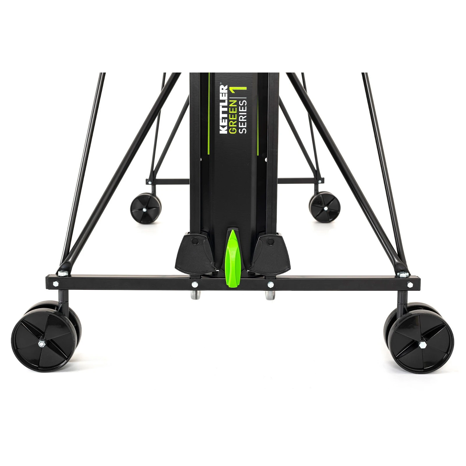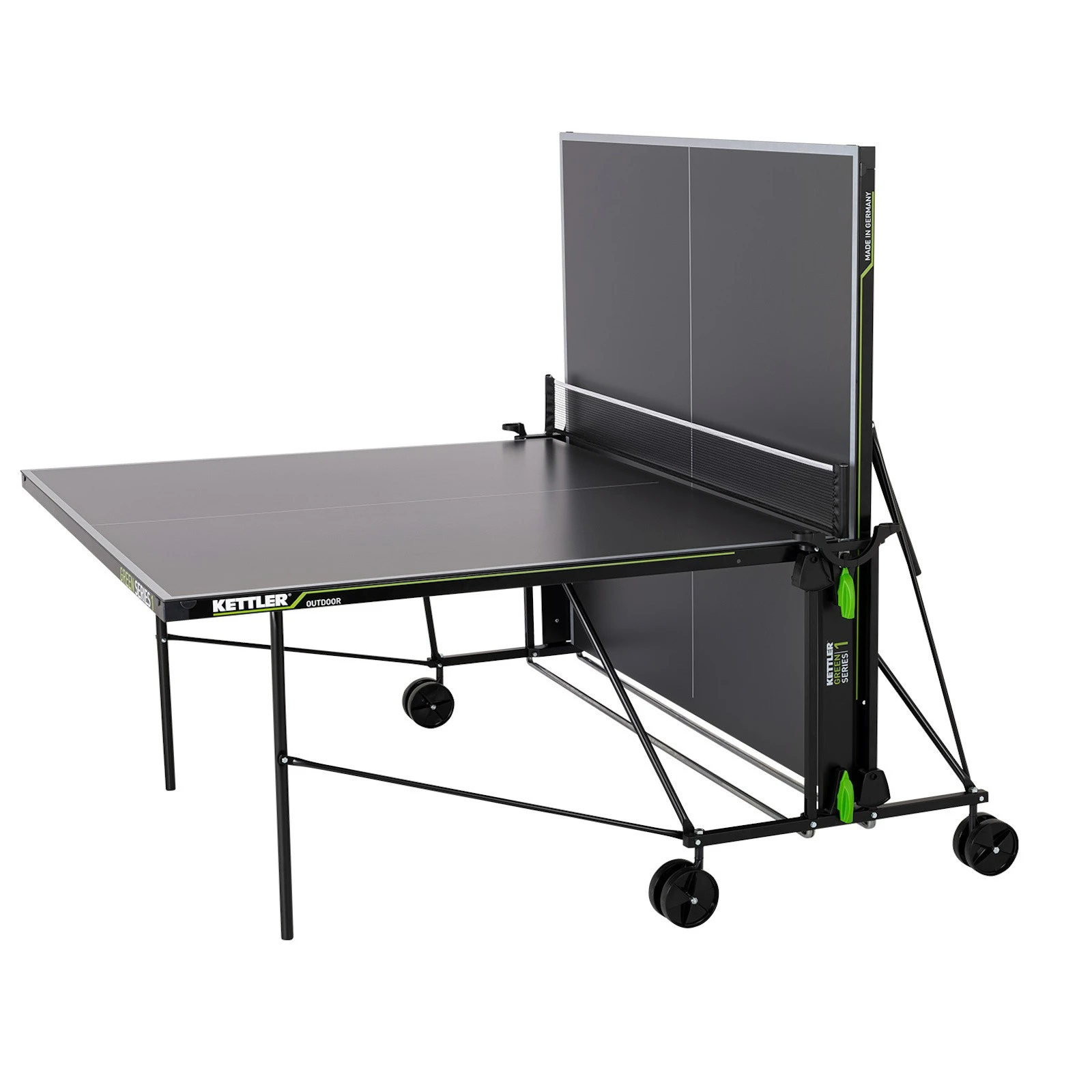 Tack vare de hopfällbara sidopanelerna är både träning på egen hand och platsbesparande förvaring möjlig. Kettler Outdoor bordtennisbord K1 har fyra tvillinghjul på underredet. Dessa egenskaper gör det lätt att flytta.