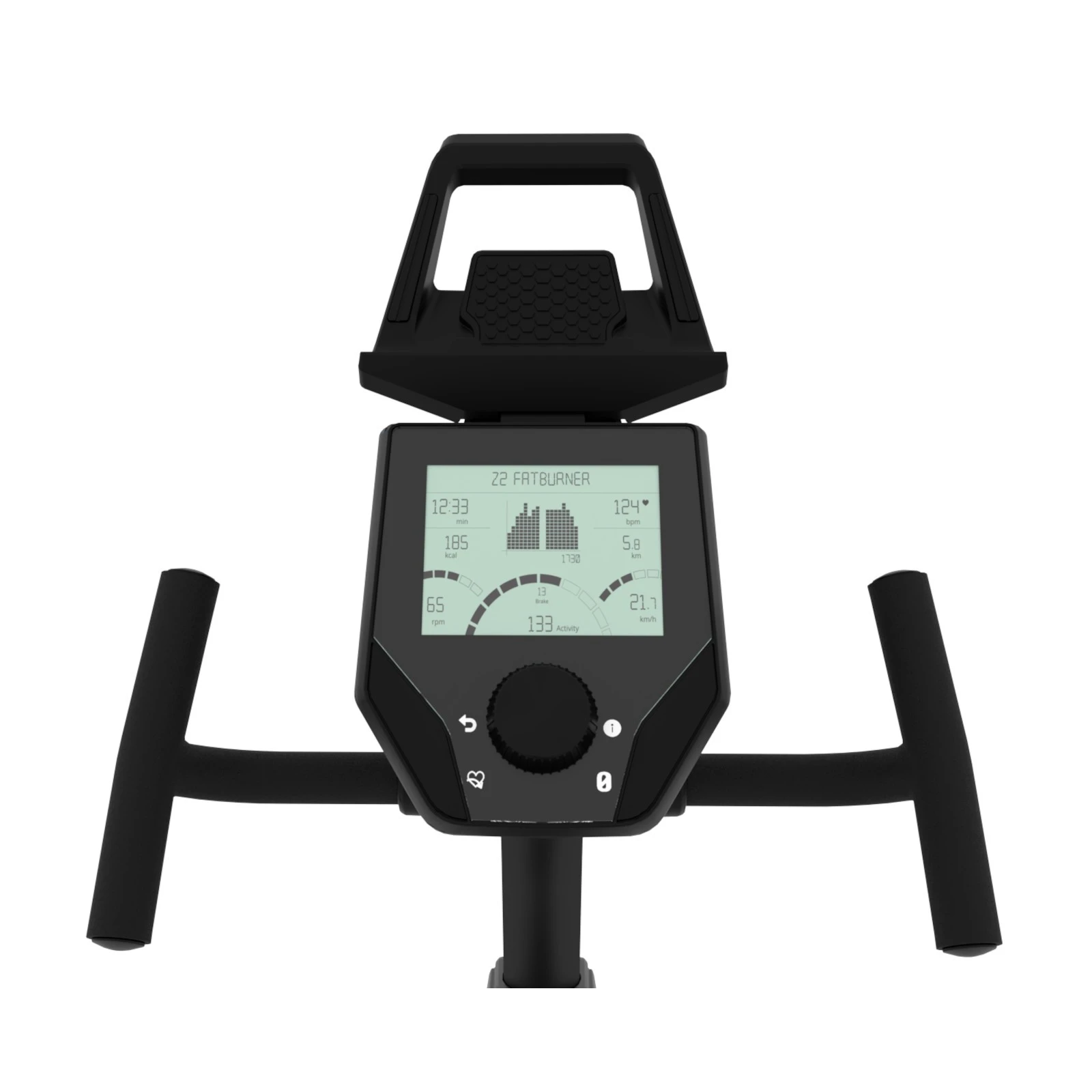 Den har en bekväm gelsadel som kan justeras horisontellt och i lutning, ett fast ryggstöd, en praktisk hållare för surfplatta och handpulssensorer för mer intensiva, pulsstyrda träningspass. Dessutom smälter cykeln tack vare sin svarta färg bra in i alla sorters miljöer och kan flyttas runt i lägenheten flexibelt med hjälp av transporthjulen. Det betyder att det är enkelt att förvara cykeln efter varje användning och inget utrymme i bostaden förblir permanent upptaget.