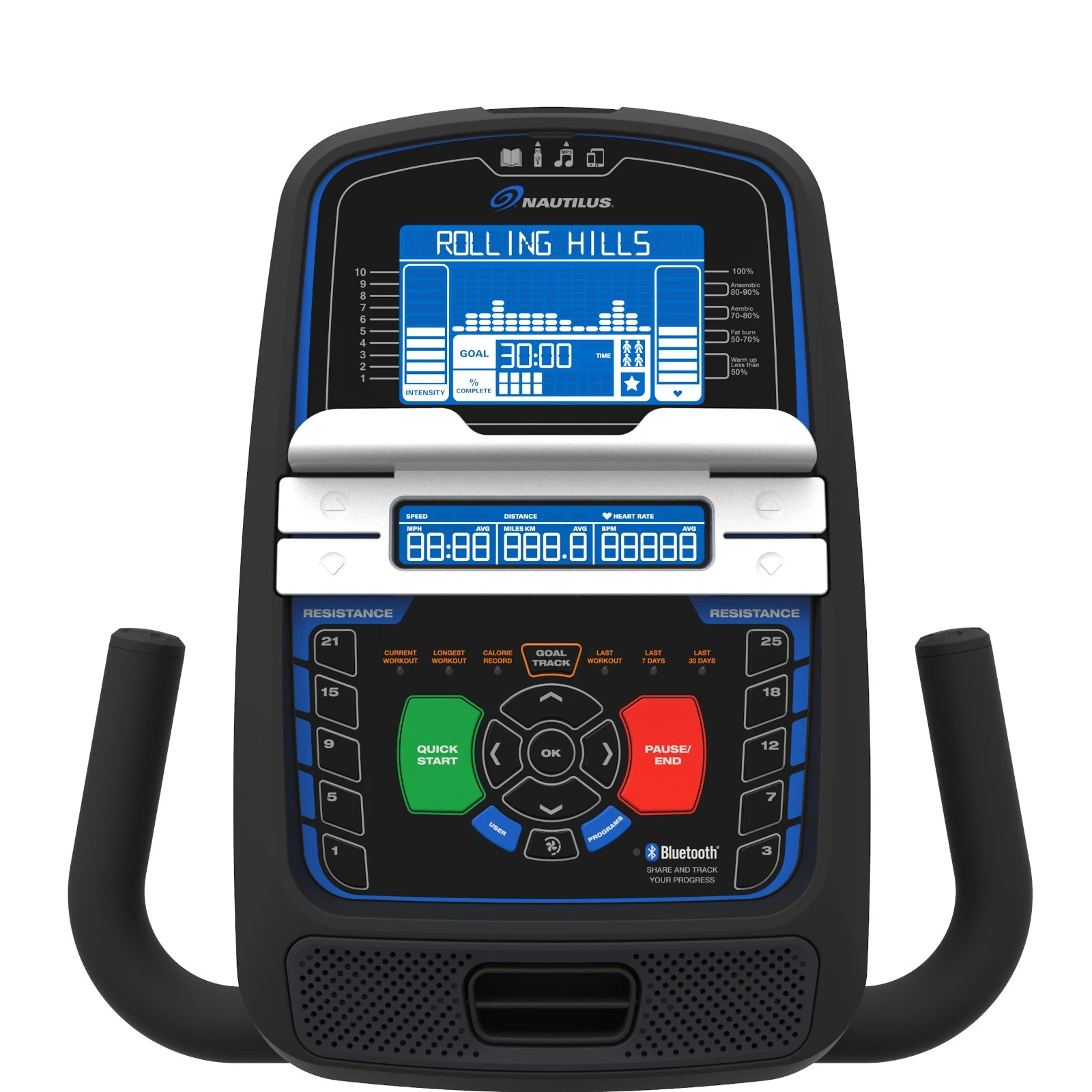 Den blå bakgrundsbelysta träningsdatorn håller dig uppdaterad om relevanta träningsdata som t.ex. puls, tid och sträcka. Dessutom kan träningsdata synkroniseras med appen Nautilus Trainer™ 2 med hjälp av Bluetooth-smartgränssnittet. För utvärdering av träningsresultaten kan informationen överföras till Nautilus Connect-träningsplattformen via USB-minnet på datorn.