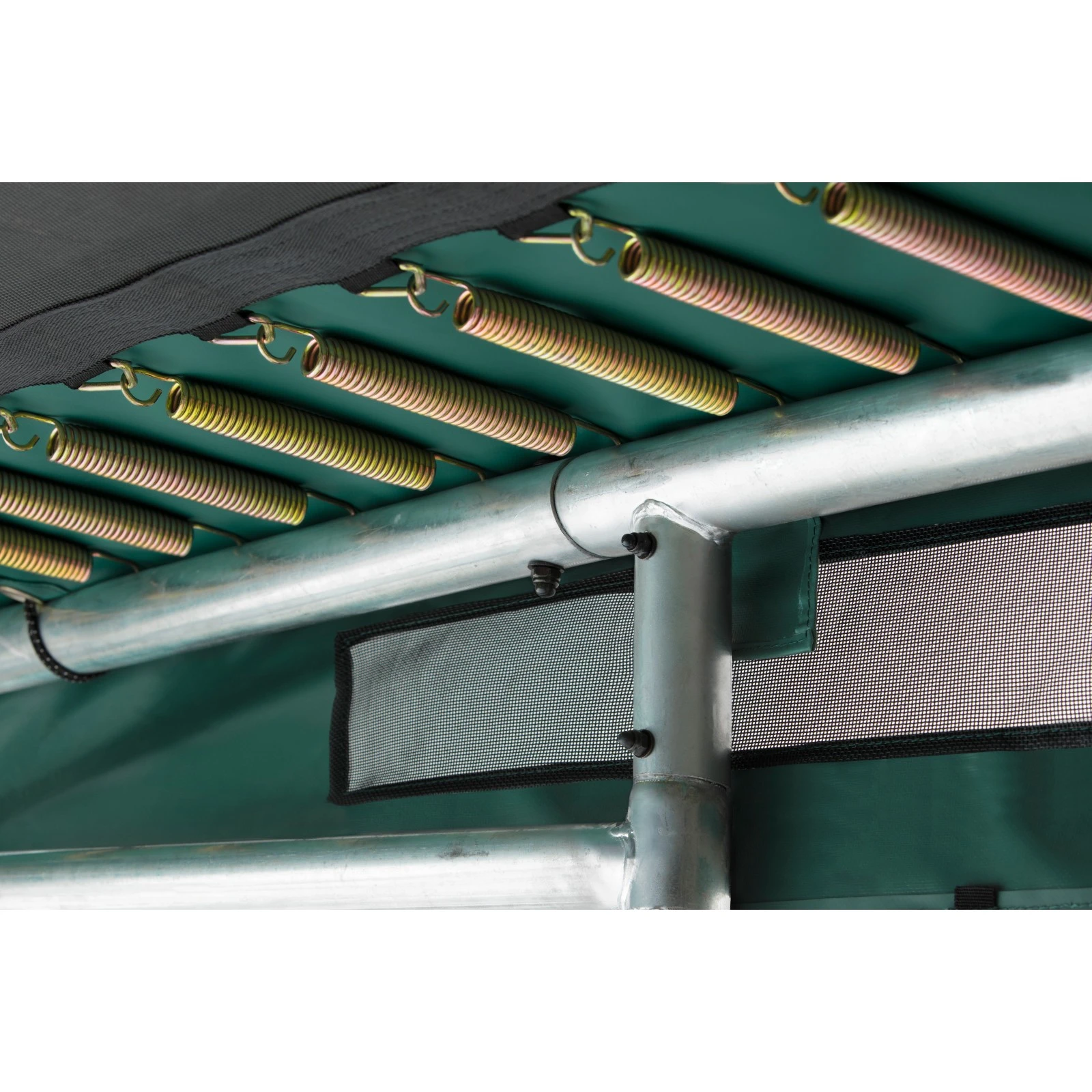 Det integrerade ventilationssystemet och den dubbelkoniska guldfjädringen garanterar en bra studs samt mjuka och säkra landningar. Ventilationssystemet i skyddskanten säkerställer bättre luftcirkulation, vilket möjliggör en utmärkt hoppupplevelse.