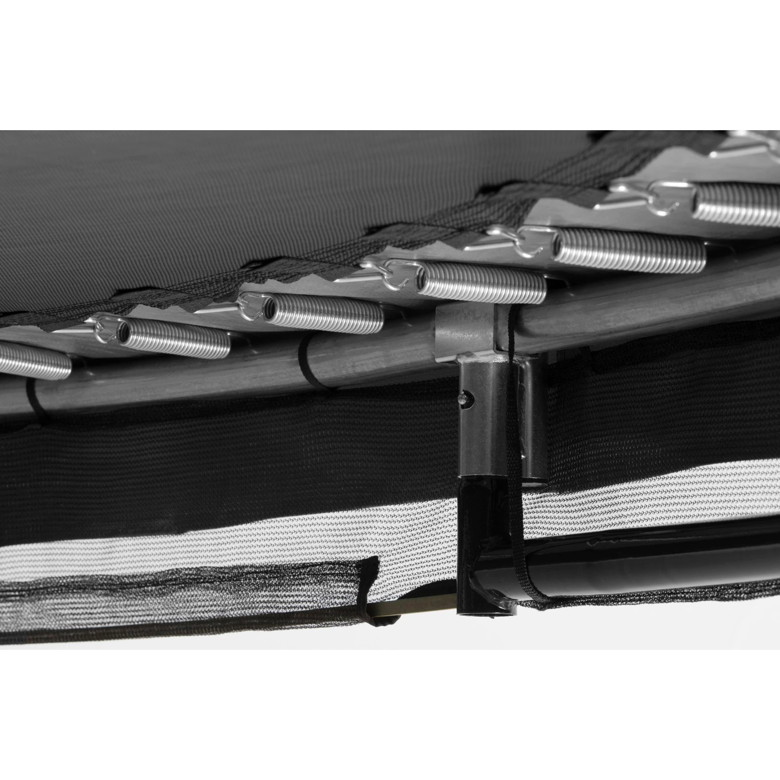 Medan den galvaniserade stålramen garanterar en lång livslängd, erbjuder det mjuka och finmaskade skyddsnätet ännu större säkerhet vid hoppningen. Dessutom är säkerhetsnätet försett med en dubbelsidig dragkedja vid ingången, vilket möjliggör enkel och säker åtkomst till studsmattan. De dubbla galvaniserade koniska fjädrarna täcks av den 20 mm tjocka och 29 cm breda skyddskanten.