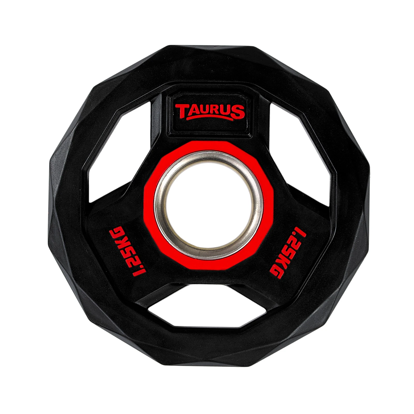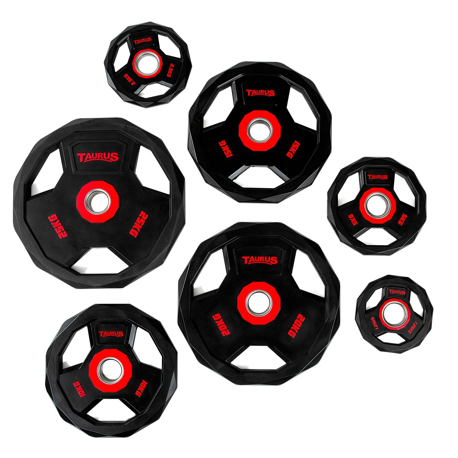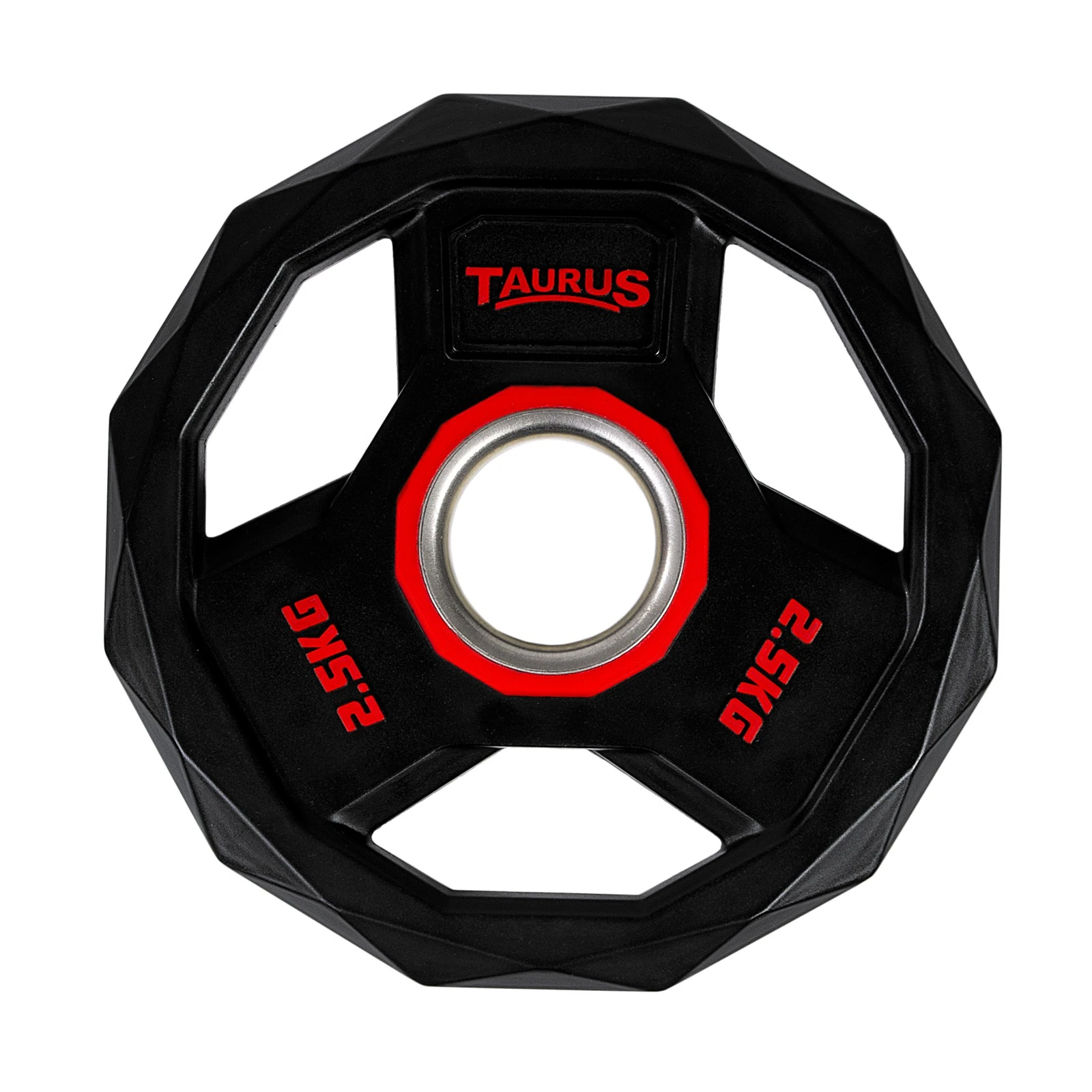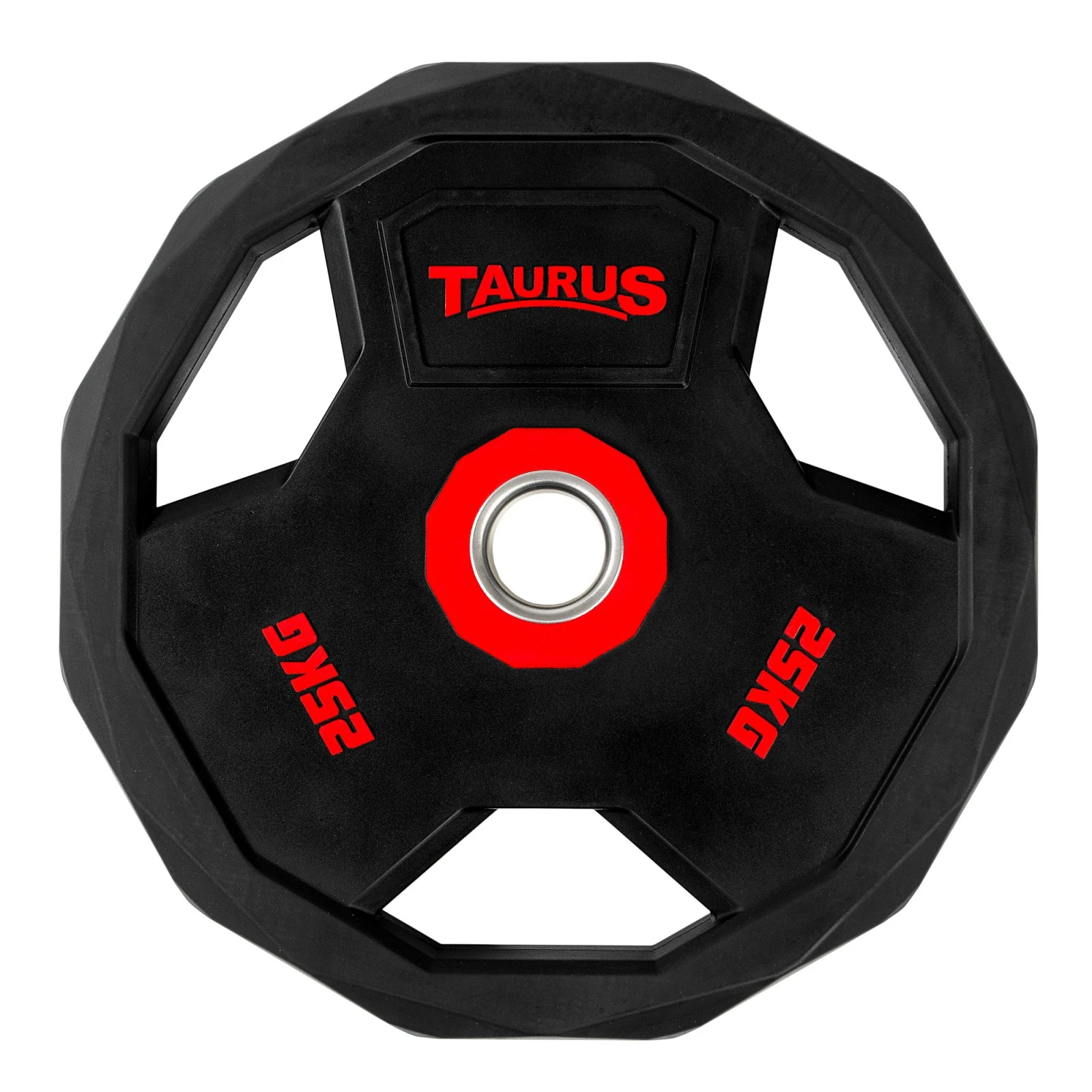 Proffsiga Taurus vikter – träningsutrustning i särsklass: mycket exakta vikter för styrketräning på högsta nivå. Genomtänkt utförande för lätt och enkel hantering. Vikterna är klädda i slitstarkt polyuretan och har praktiska grepphål. Runtomkring hålet på 50 mm i diamter sitter en avrundad ring av rostfritt stål. Taurus 50 mm-viktskiva PU 3G Pro kan enkelt och smidigt sättas på skivstången. Genom ”diamantslipning” — får vikstkivan 12 kanter — och kan inte rulla bort.