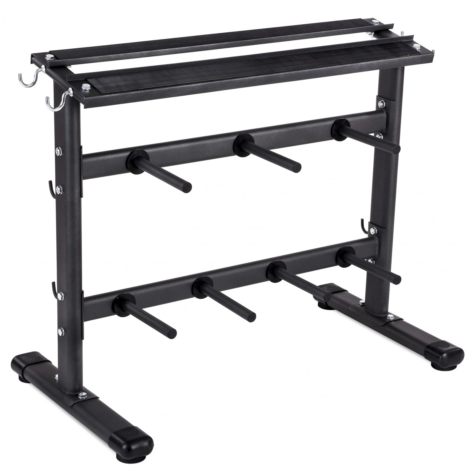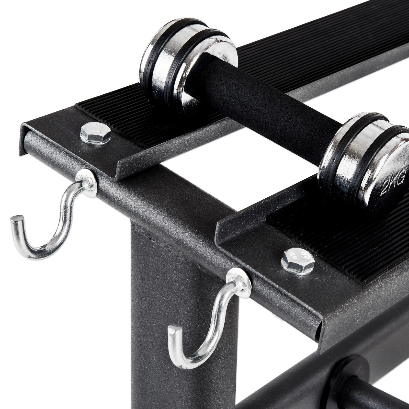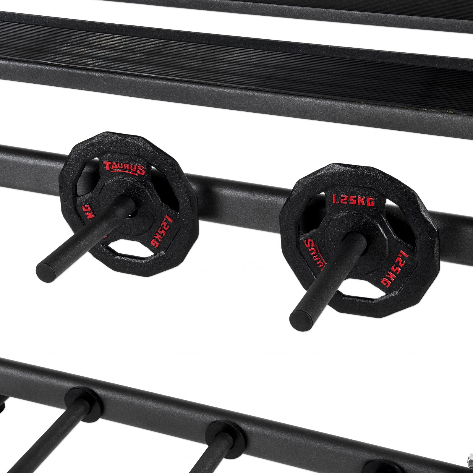 Taurus Hantel- och viktställ är en mångsidig och robust förvaringsplats för en mängd olika träningsredskap. I detta kombinerade hantelställ kan du förvara kompakta hantlar, små hantlar, viktskivor med en diameter på 30 mm, skivstänger och tillbehör. Ställningen erbjuder, på relativt liten plats, mycket utrymme för styrketräningsredskap.