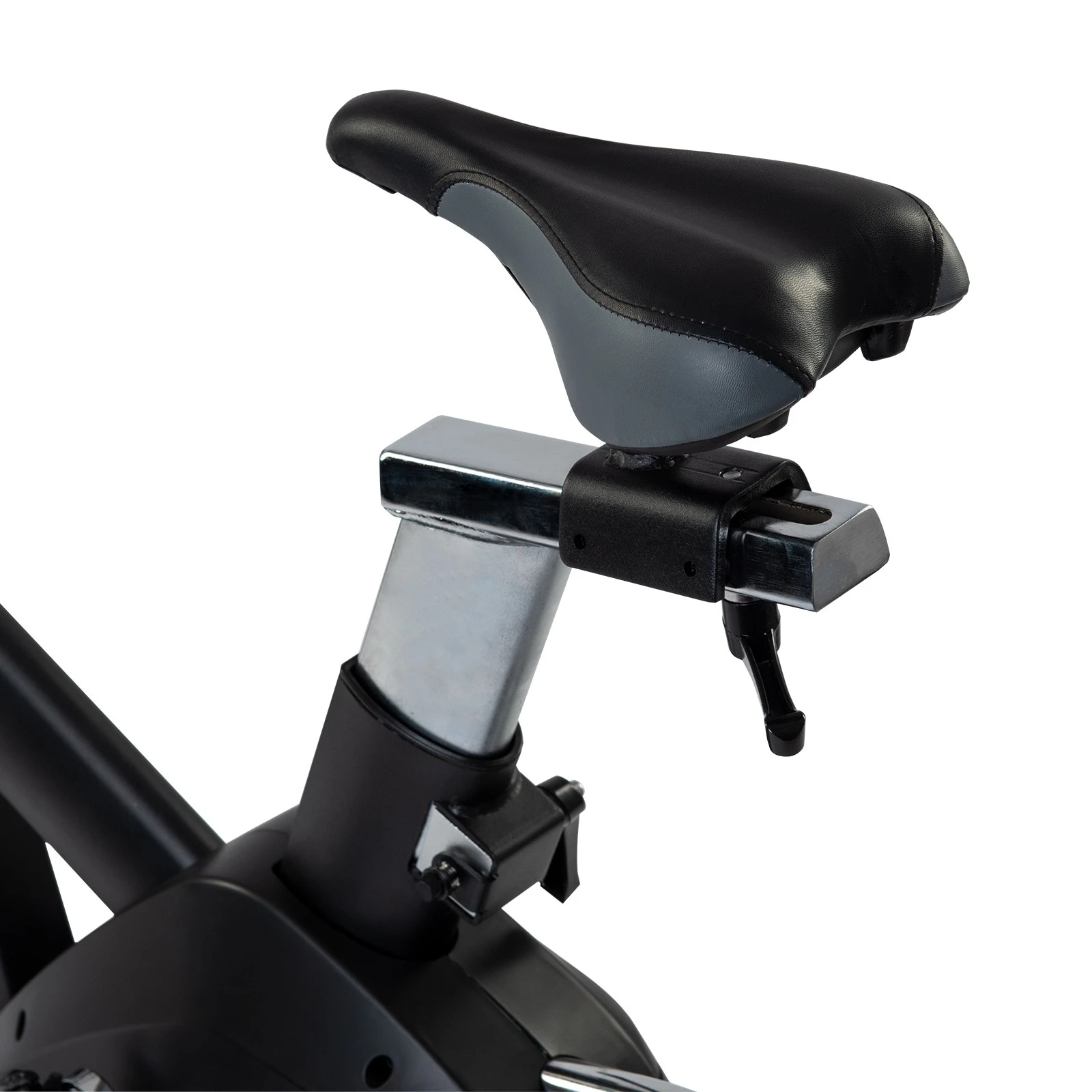 Sadeln är en äkta tävlingssadel och kan bytas ut precis om en riktig cykelsadel. Den är justerbar i höjdled såväl som i avstånd fram till styret, och därtill kan också lutningen justeras. Justeringen sker steglöst men som hjälp finns en skala. På det sättet hittar du alltid din personliga sittposition på nolltid.