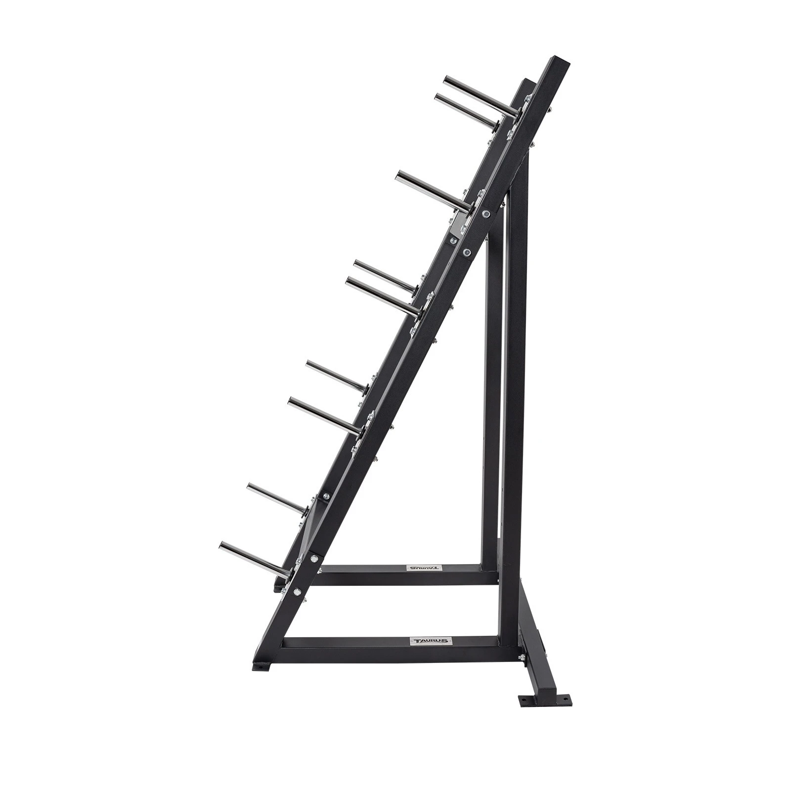 The Taurus weight plate rack Pro is a professional weight plate rack designed for 30 mm weight plates. It is possible to purchase sleeves for 50 mm weight plates separately to accommodate them on the rack. The rack ensures order in private fitness rooms as well as in fitness studios and has a maximum load capacity of 500 kg. There are a total of 10 holders for weight plates with a length of 20.5 cm, arranged in a well-thought-out design to store the weights in an organized manner and allow for easy and safe handling.