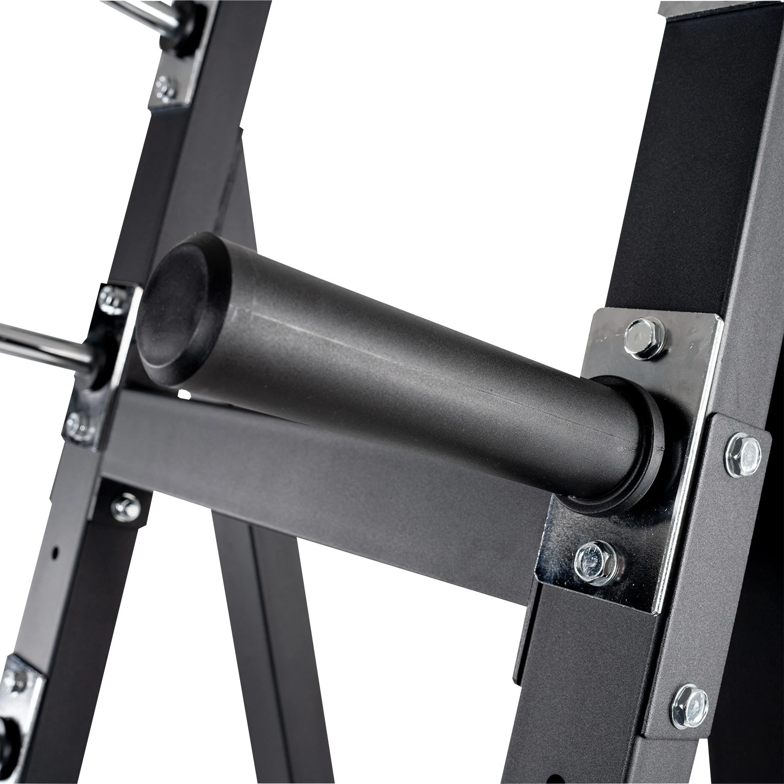 The steel construction of the weight plate rack is very sturdy and has a stylish and durable anthracite powder coating. The distance between the weight plate holders increases from top to bottom, allowing for perfect storage of different weight plates and sizes. The rack has pre-drilled holes to anchor it to the floor if necessary.