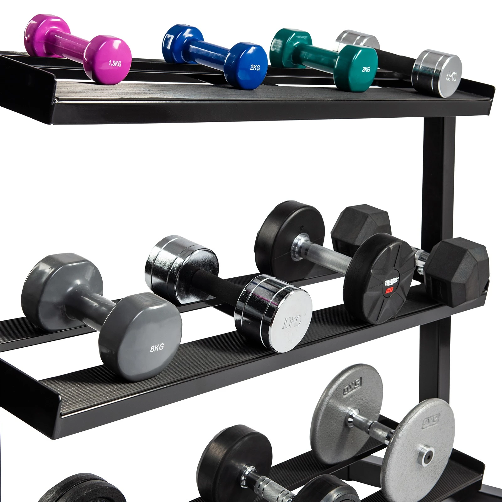 Taurus Ställning för hantlar KHS 30 har 3 hyllor för totalt 18 par träningshantlar eller 9 par små hantlar. Dina hantlar är alltid till hands under träningen.